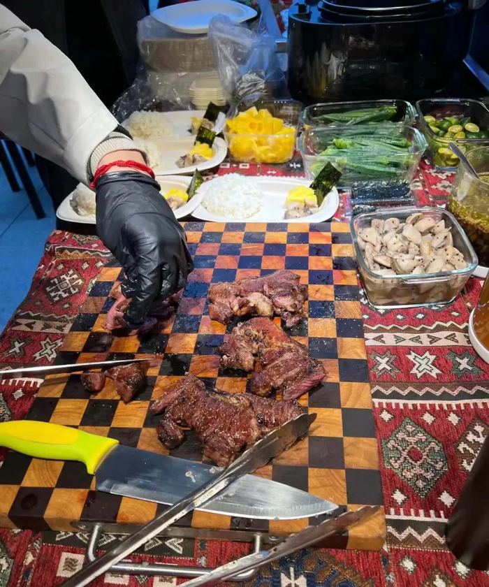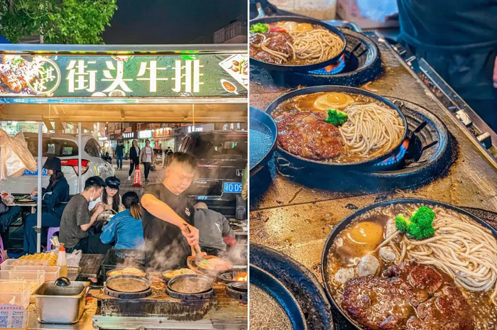 小小的餐车或摊位上,一块块诱人的牛排整齐码着。铁板上的牛排在火焰中滋滋作响,焦香四溢,偶尔还有窜起的火焰,吸引着路过的行人驻足。