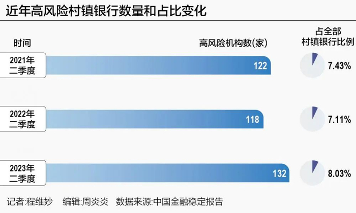 央行发布的《中国金融稳定报告(2023)》结果显示,参评4364家银行业金融机构中,高风险机构共有337家,其中农合机构以及村镇银行的高风险机构数量分别为191家和132家,共占全部高风险机构的96%。132家这个数量,在全部村镇银行中,占比超过8%。