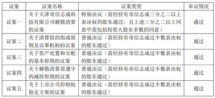 根据公告,此次奇信志成股东通过的议案包括5个,涉及奇信志成解散清算、资产分配、减持原则、360控制权稳定方案等。虽然周鸿祎均未投赞成票,但由于周鸿祎仅持有奇信志成17.38%的股权,这五项决议依然全部通过。