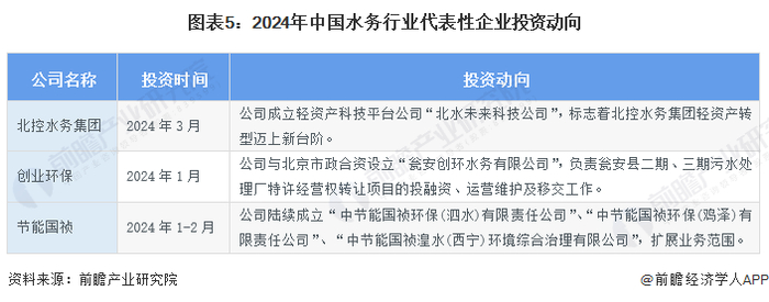 2024年1-5月,水务行业代表性企业的投资动向包括北控水务集团成立轻资产科技平台公司、创业环保成立合资公司专营污水处理项目、节能国祯在多地成立区域子公司拓展业务范围。