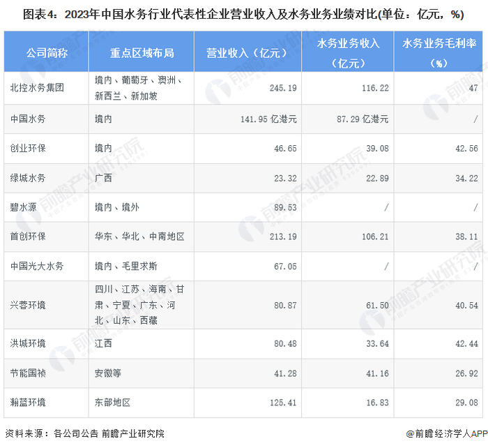对比水务行业代表性企业的业务布局和业绩表现来看,北控水务集团、碧水源、中国光大水务的业务布局涉及海内外,营业收入和水务业务收入最高、水务业务盈利能力最强的水务公司均为北控水务集团。