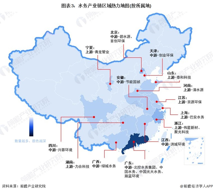 总体来看,水务行业涉及的企业数量较多,相对集中在东部地区。其中,上游企业分布广泛,涉及宁夏、湖南、浙江、上海、江苏、河南、山东等地;中游企业相对集中,涉及广东、四川、北京、天津、江西、安徽等地区。
