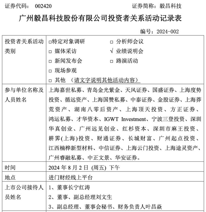 8月2日,毅昌科技在最新一次的业绩说明会上,展示了其在新能源板块的雄心壮志,并透露了公司未来三年的发展战略。董事长宁红涛、副总经理刘文生以及副总经理兼董事会秘书叶昌焱出席了此次活动,与投资者进行了深入的交流。
