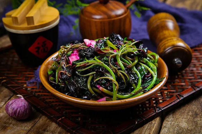 鲜嫩的红苋菜焯水后,油锅里爆香蒜蓉和葱花,猛火爆炒,只需三两分钟,就能收获一盘艳红且香气扑鼻的菜肴,配米饭最佳。
