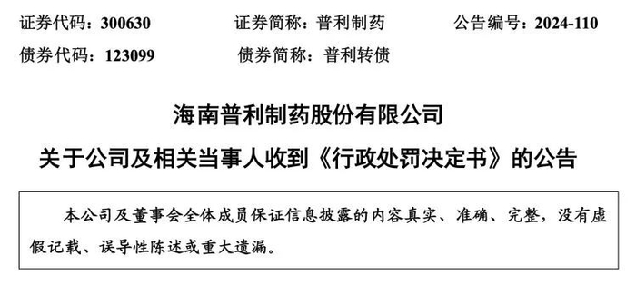 普利制药公告,公司及相关当事人收到海南证监局下发的行政处罚决定书,因未按期披露2023年年度报告,海南证监局决定对普利制药给予警告,并处以100万元罚款;对董事长、总经理范敏华给予警告,并处以40万元罚款;对董事、副总经理、财务总监罗佟凝给予警告,并处以30万元罚款。