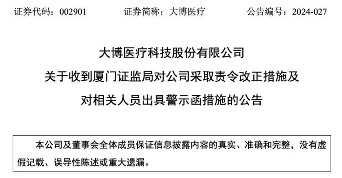 大博医疗公告,近日,公司及相关人员收到厦门证监局出具的行政监管措施决定书。因关联人名单及关联关系披露不完整、信息披露事务内部管理不规范、内幕信息知情人登记管理制度执行不到位、闲置募集资金使用不规范、年度报告信息披露存在简单错误等,厦门证监局决定对大博医疗采取责令改正的监督管理措施,对董事长林志雄、总经理罗炯、董秘华贤楠、财务总监陈丹荷采取出具警示函的监督管理措施,并记入诚信档案。
