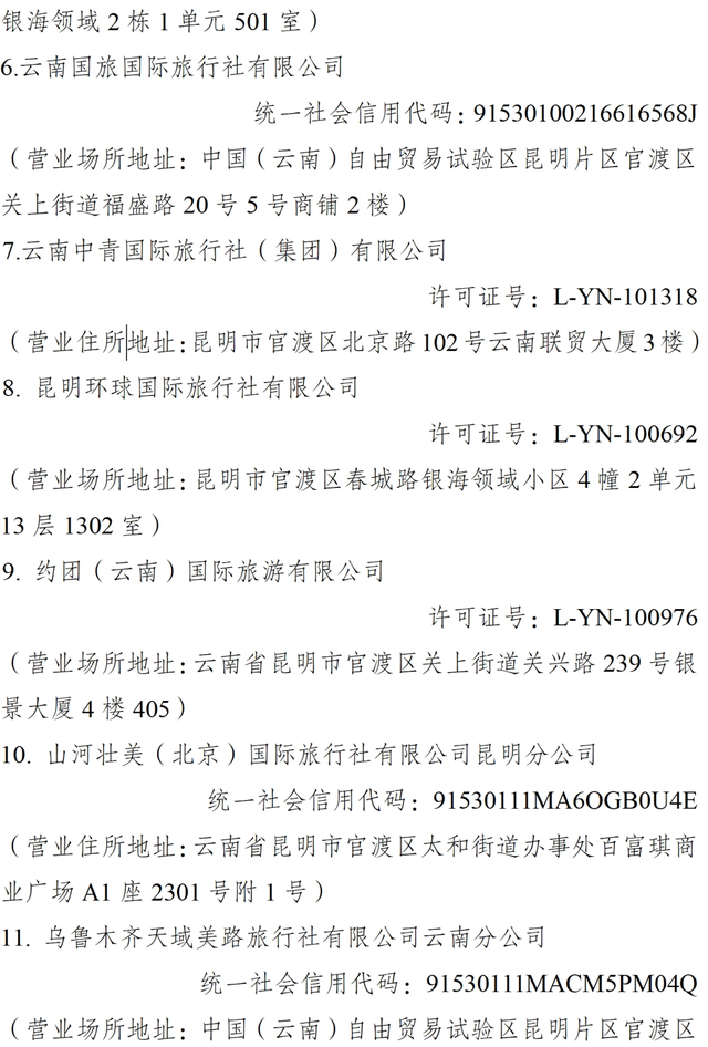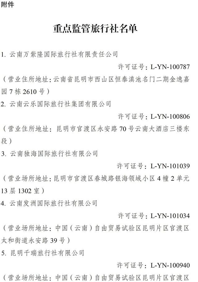 根据《云南省旅游市场秩序整治工作领导小组办公室关于印发加强旅游市场秩序整治若干工作措施的通知》(云旅整治办〔2023〕1号)有关精神,决定将全省2024年5-6月投诉量排名靠前的12家旅行社列入全省重点监管名单。昆明市文化和旅游局须对重点监管名单所列旅行社进行约谈,并列入州(市)旅行社红黑榜的“黑榜”进行重点监管,同时联动相关部门对重点监管名单所列旅行社进行全面复核。相关情况请于8月20日前书面报省文化和旅游厅。
