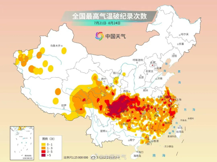 2022年7月21日到8月25日,高温日数超过20天的站次面积达到130万平方公里,接近整个新疆的大小,其中浙江23个、江西18个、湖南8个、福建2个站点,分别达到高温日数大满贯。