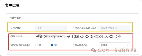 (2)请在填写“现居住住址”时,一并填写申报学校,即学校+住址,如:羊山新区外国语小学,羊山新区XX街XX小区XX号楼(见下图)。
