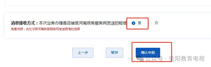 7.填写完成后,点击“确认并下一步”,进入信息核对页面,请在此页面仔细检查填写的报名学校、现居住住址、联系电话等信息是否有误。如手机号码有误,将无法接收办理、录取结果提醒。如信息无误,在页面最下方,选择“本次业务办理是否接受河南政务服务网发送的短信:是”,点击“确认申报”。