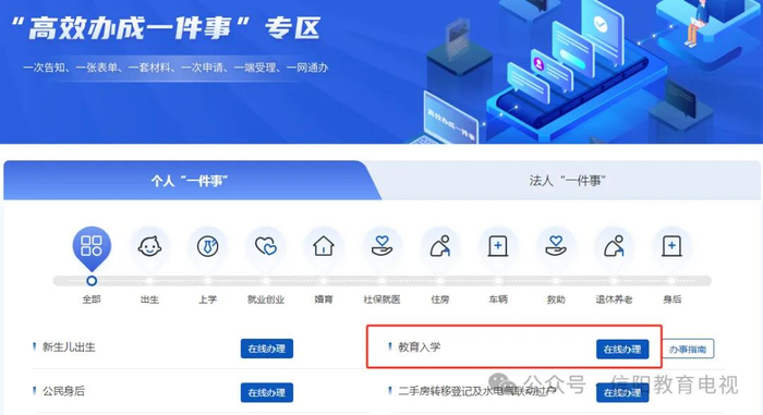 2.登录后,在首页“高效办成一件事”专区,点击“教育入学”——“在线办理”。