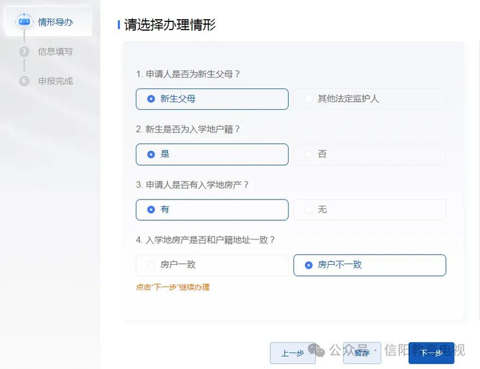 5.请根据家庭实际情况,逐步选择办理情形,并点击“下一步”(如下图,图中仅为示例,请根据个人实际选择)。不同办理情形,后续所需填写的信息不同,请如实认真填报。如填写虚假信息,将影响办理进程和录取结果。只要信息真实准确,报名方式不影响录取结果。