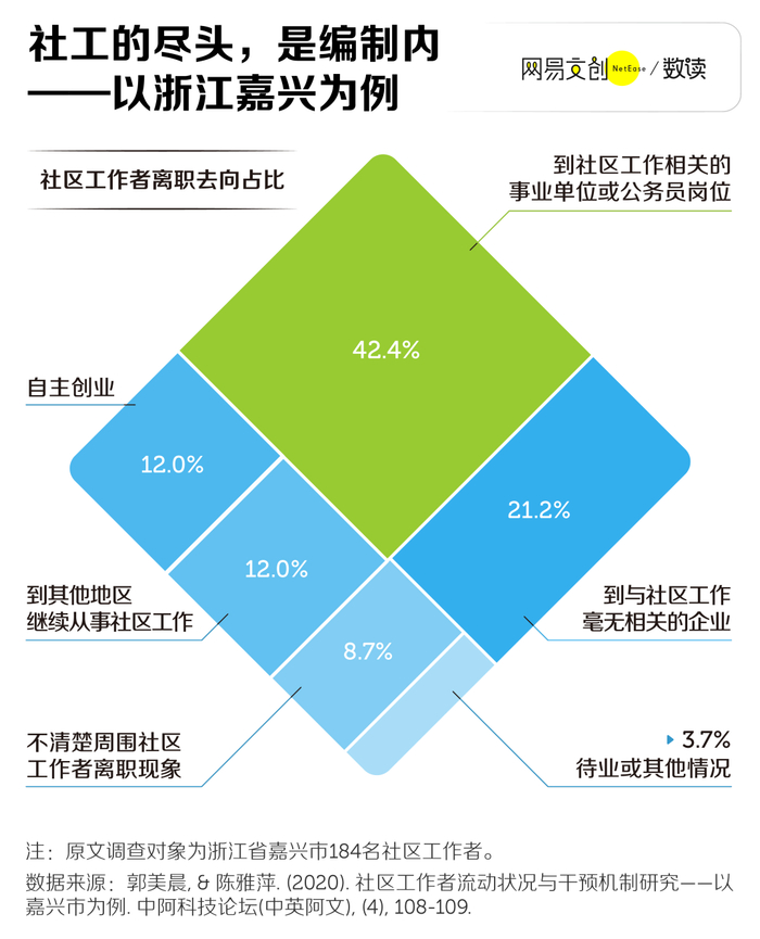 以嘉兴市为例,那些辞职的社工们,有 21.2% 的人不再死磕社工,去到与之毫不相关的企业。但也有 42.4% 的人依然就职于与社区工作相关的事业单位或公务员岗位。