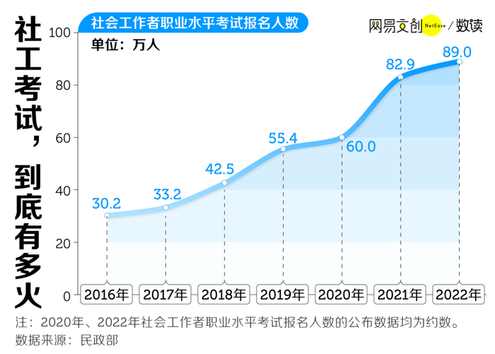 即便用处不大,人们考证傍身的野心却不小。从 2016 年到 2022 年,社工考试的报考人数就翻了不止一番。特别在 2021 年,报名人数直接上涨了 38.2%。