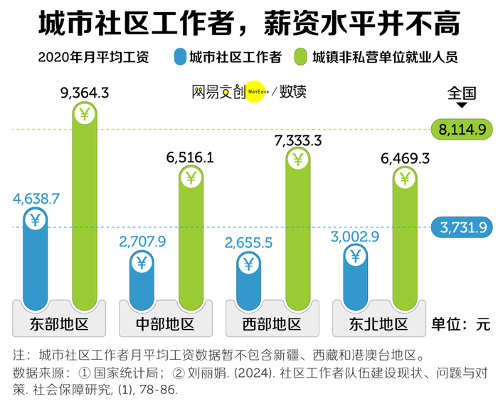 民政部政策研究中心学者的研究显示,2020 年全国城市社工的平均工资是 3731.9 元,就算翻倍也比不上城镇非私营单位就业人员的工资。