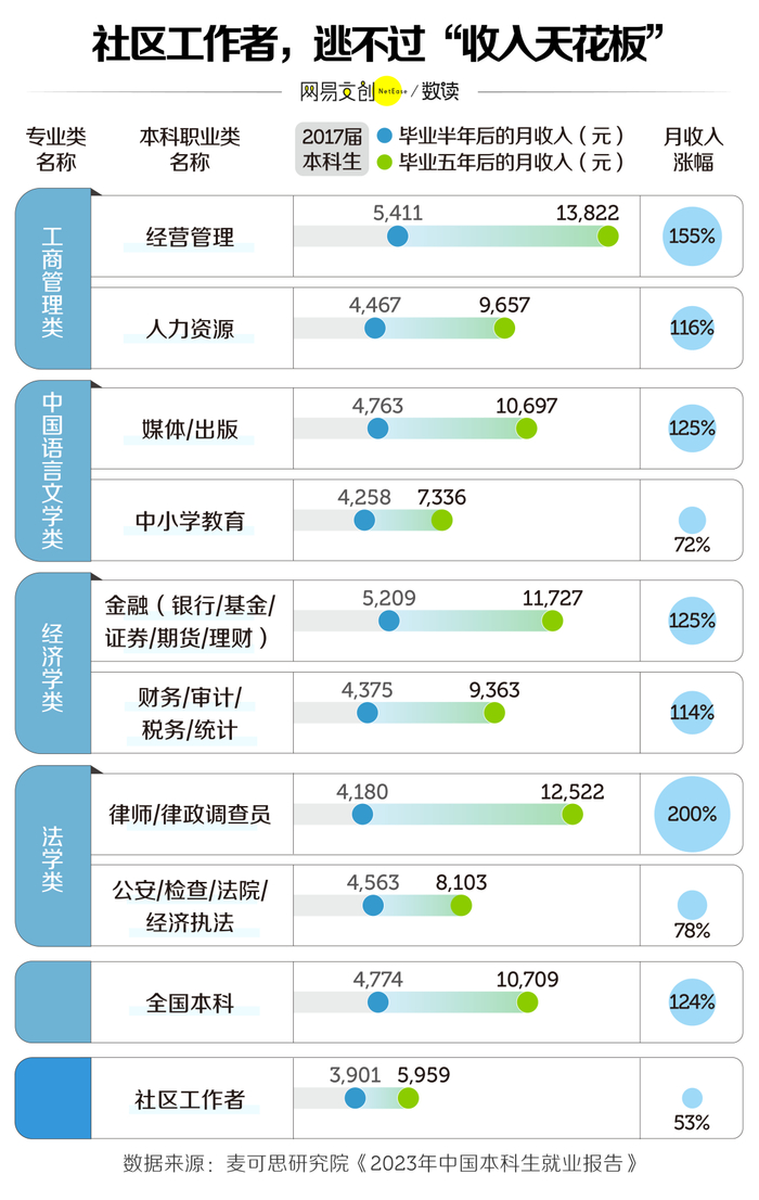 没前景的同时,社工还没有“钱景”。麦可思研究院的数据显示,从事社工的 2017 届本科生在毕业五年后月收入涨到了 5959 元,摆脱了月薪三千的魔咒,但涨幅却远低于全国本科生 124% 的平均数。