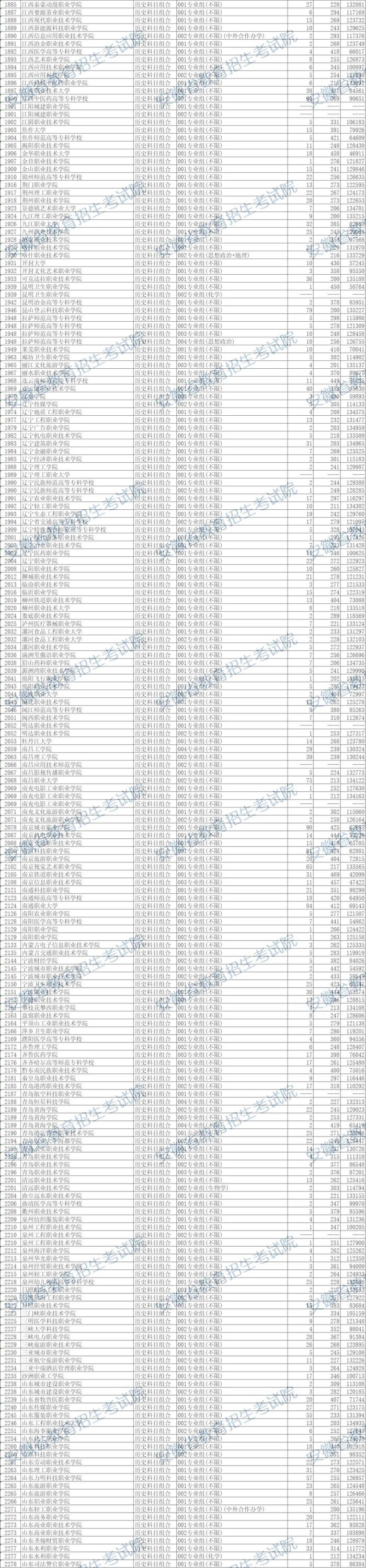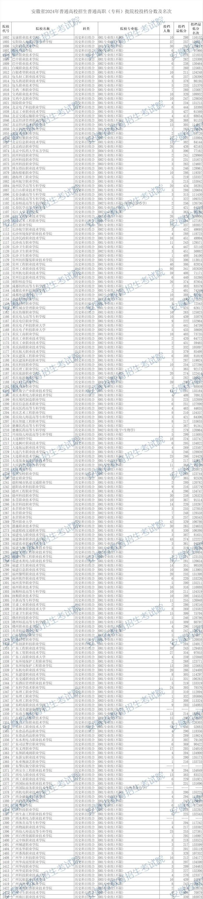 安徽省2024年普通高校招生普通高职(专科)批院校投档分数及名次(历史科目组合)