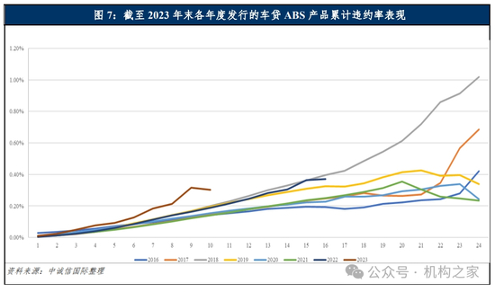 同时,据中诚信国际的相关资料、再从2023年的汽车贷款证券化(ABS)情况来看,当年在银行间市场共发行了产品38 只,规模1799.77亿元,同比分别下15.56%和17.51%(降幅比平安银行该项贷款规模更为明显)。在数量下降的同时,逾期违约情况也明显抬头。存续产品基础资产1~30天逾期率在0.743%~1.344%之间,31~60天逾期率在 0.109%~0.169%之间,61~90天逾期率在0.071%~0.108%之间,均明显高于往年。