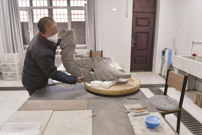 2023年3月4日,邺城考古队文物修复室内,考古队员夏振民在修复超大型鸱尾。大型鸱尾的出土,从侧面反映出当时宫殿的规模。