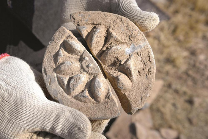 2023年3月4日,在邺城遗址考古现场,考古队员手拿两个刚出土的瓦当进行比对。