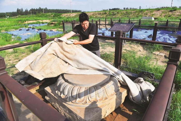 7月27日,在邺城遗址考古现场,邺城考古队队员马福堂为206大殿前的柱础盖上苫布,确保安全度汛。
