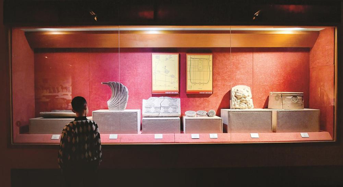 2023年3月4日,邺城博物馆内的展柜前,一名小朋友在观看邺城遗址出土的建筑构件。