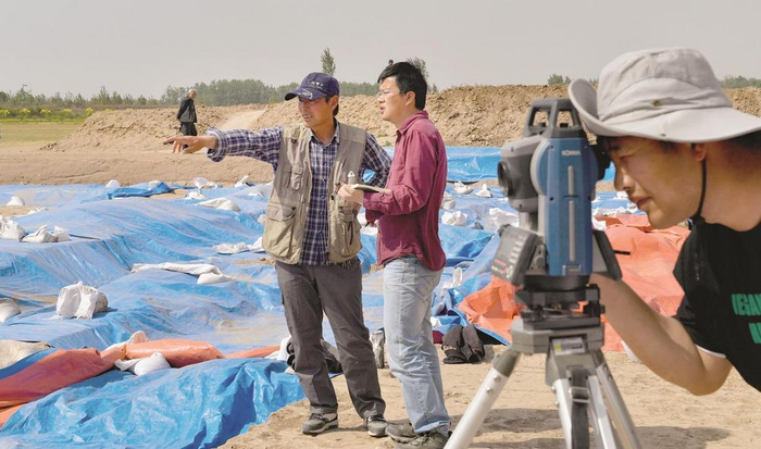 2023年4月15日,在邺城遗址考古现场,沈丽华(左二)与考古队员韩庆林商量考古方案。