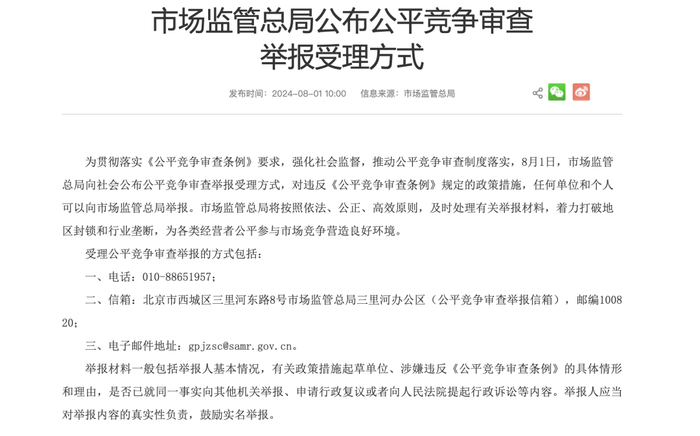 为贯彻落实《公平竞争审查条例》要求,强化社会监督,推动公平竞争审查制度落实,8月1日,市场监管总局向社会公布公平竞争审查举报受理方式,对违反《公平竞争审查条例》规定的政策措施,任何单位和个人可以向市场监管总局举报。