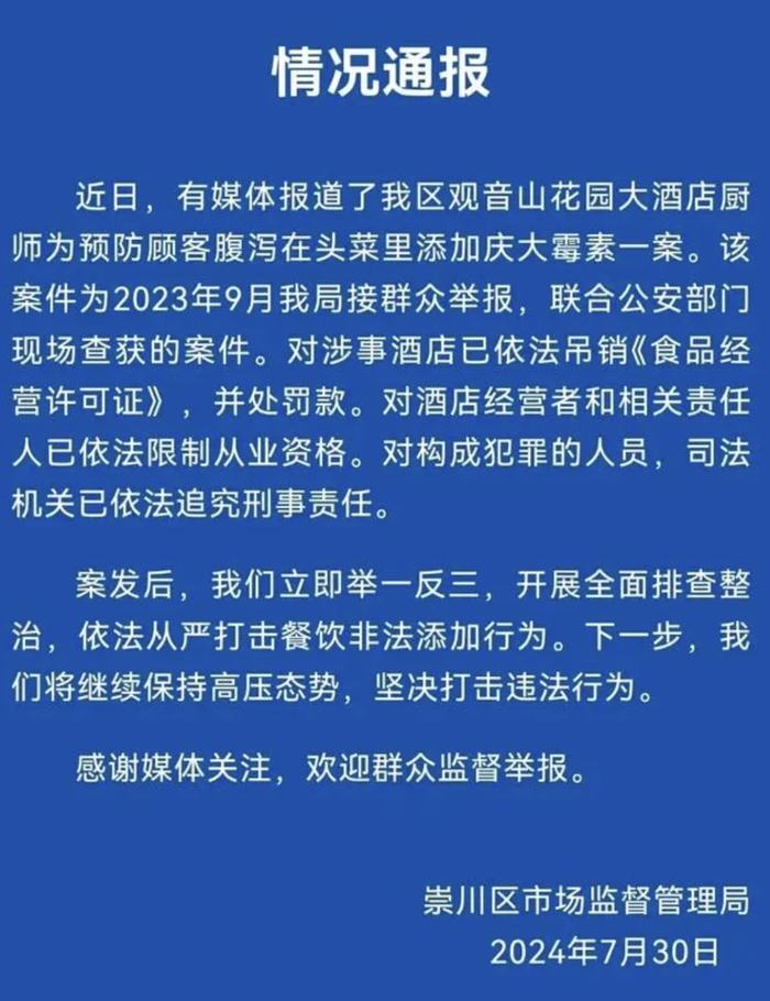 近日,有媒体报道了江苏南通崇川区观音山花园大酒店厨师为预防顾客腹泻在头菜里添加庆大霉素一案。30日,崇川区市场监督管理局发布情况通报,该案件为2023年9月崇川区市场监督管理局接群众举报,联合公安部门现场查获的案件。对涉事酒店已依法吊销《食品经营许可证》,并处罚款。对酒店经营者和相关责任人已依法限制从业资格。对构成犯罪的人员,司法机关已依法追究刑事责任。