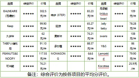 本次试验按各项目的平均分对20个品牌进行综合评价,存在不符合标准项目的3个品牌(波亚米特、乐卡利、乐途)不参与综合评价。有11个品牌表现优秀,获评五星;6款表现良好,获评四星。