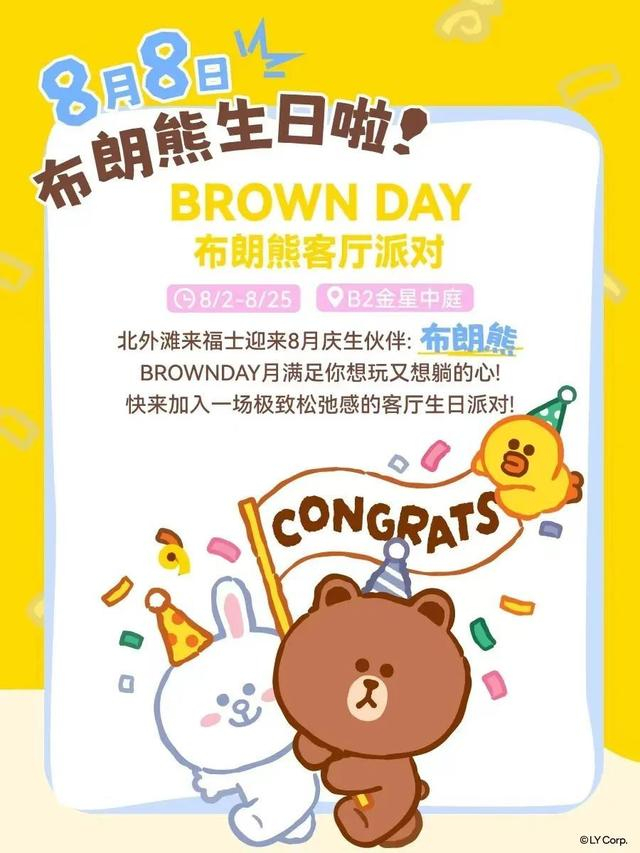 如果宝贝的生日在8月,就一起来北外滩来福士参加布朗熊的生日派对!在北外滩来福士B2金星中庭,布朗熊客厅派对等你来打卡哦。参与互动,即可获得专属礼品,让孩子的笑容更加灿烂。更有集章抽奖活动,赢取更多惊喜。别忘了参加落日派对,在浪漫的氛围中享受亲子时光,即兴开启自由社交。
