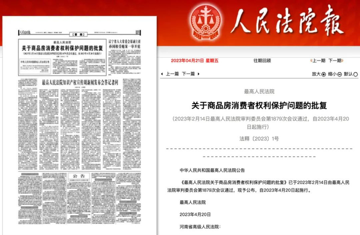 接着是2023年4月,人民法院报公布的《最高人民法院关于商品房消费者权利保护问题的批复》中明确提到: