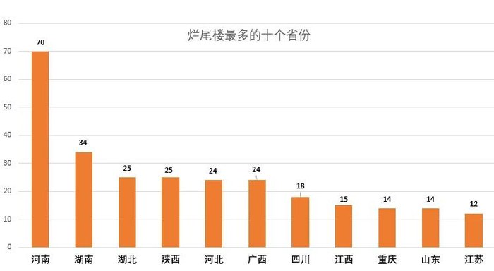 其中,烂尾楼最多的省份是河南,有70个楼盘;烂尾楼最多的城市是郑州,有45个楼盘;烂尾楼最多的开发商是恒大,有87个。