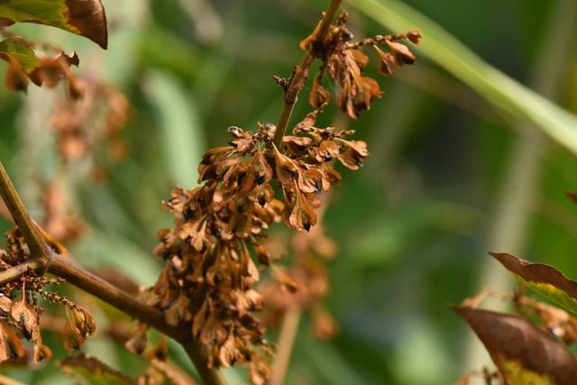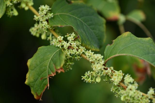 虽然虎杖体型高大,但开的花却很袖珍,其貌不扬的淡绿色小花挤在叶片的胳肢窝(叶腋)处。虎杖的果实背部生有三条棱,每条棱上安插了一片果翅,果实成熟后随风传播。