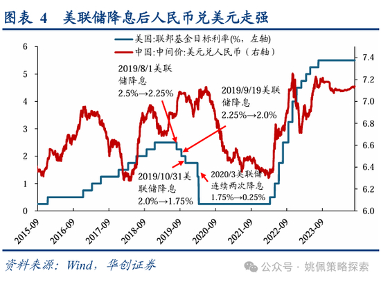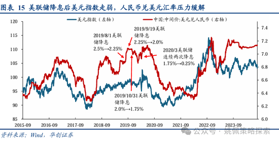 美联储降息或带动美元走弱,人民币兑美元汇率压力缓解。拉长时间维度来看,美联储降息最大的影响可能在于人民币汇率的变动,但人民币汇率本身还要取决于国内经济基本面的变化,因此美联储降息→人民币升值的传导可能没有那么迅速。2019年8月美联储开启降息,并于9、10月连续两次降息,但人民币并未出现显著升值,直到20年初疫情扰动下美联储3月连续两次大幅降息,以及国内防疫优势逐渐体现,人民币于20/5开启一波持续升值。