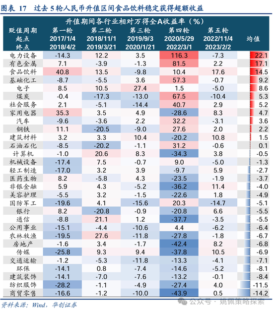 人民币升值区间A股大概率上涨,食品饮料、电子、家电稳定贡献超额收益。我们选取过去5轮典型的人民币升值区间,包括17/1-18/4、18/11-19/3、19/9-20/1、20/5-22/3、22/11-23/2。5段区间内A股整体上涨,万得全A均录得正收益,涨幅均值15.5%。从行业表现来看,电力设备、有色金属、食品饮料、基础化工、电子涨幅均值靠前,其中食品饮料、电子、家电均在5轮区间中4次获得超额收益,表现更为稳定。