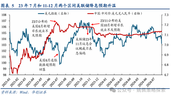 背后逻辑:海外掣肘缓解,国内政策宽松预期升温,经济强相关的行业受预期影响更大,但最终仍要回归基本面判断。美联储降息对A股的短期影响更多体现在分母端,即由美联储降息带动人民币汇率压力缓解,国内货币政策空间打开,经济修复预期增强,市场对于经济强相关的大盘价值风格更为青睐,且顺周期的资源品和消费板块更为受益。但这一因素并不能决定趋势性的走向,最终仍要回归基本面的判断。典型如23年11-12月美联储降息预期升温区间,由于基本面压力较大且A股盈利预期持续走弱,基本面仍是A股定价的核心因素,市场并没有因为美联储降息的预期而迎来上涨,同时大盘价值以及顺周期的资源品和消费行业都出现了较大幅度下跌。