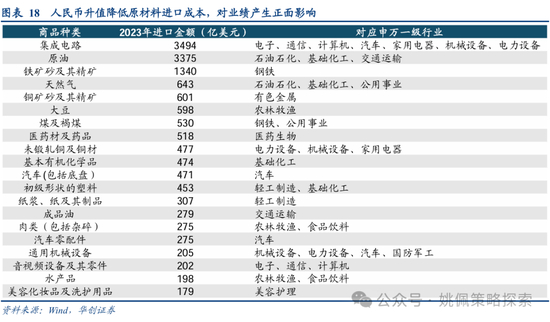 进口:人民币升值降低原材料进口成本,对业绩产生正面影响,关注石化、基础化工、钢铁等行业。对于需要进口原材料的行业来说,人民币升值后其成本下降,或将对其业绩产生正面影响。从2023年我国进口的主要商品种类来看,主要对应上游中的石化、化工、钢铁、有色、公用,以及汽车、机械、电力设备为代表的制造业。