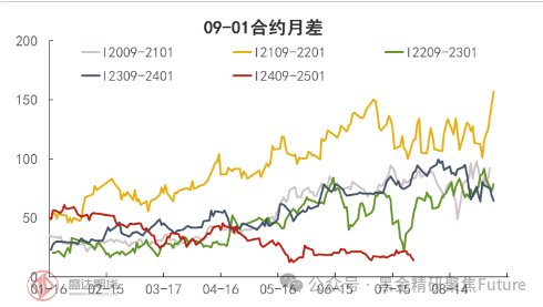 铁矿09-01期差 远月强于近月,处于历史同期低位