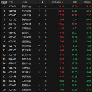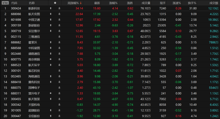 近日,商业航天板块表现活跃。据《科创板日报》统计20家A股商业航天上市公司股价走势,近三分之一公司本周涨幅超10%。其中,航新科技、航天宏图、中国卫通涨幅居前,分别为34.14%、22.64%、17.97%。