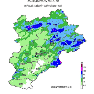 受高空槽、切变线和副高共同影响,8月3日16时到8月4日16时,全省大部地区出现降水天气。根据国家站和区域站监测数据统计,全省共341个站点出现暴雨以上降水(超过50毫米),其中张家口、承德、唐山、秦皇岛、沧州45个站点达到大暴雨以上(超过100毫米),最大降水量出现在沧州黄骅港保税区站,为210.3毫米。雷雨时局地伴有短时强降水、短时大风强对流天气,承德滦平安纯沟门站最大小时雨强为89.7毫米,唐山曹妃甸龙岛站出现27.8m/s短时大风。