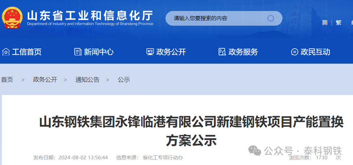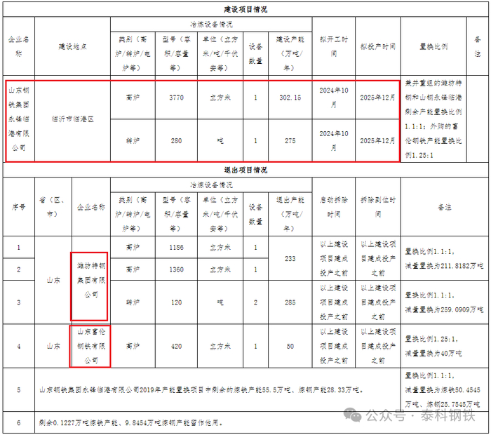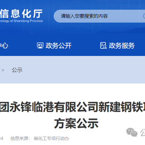 2024年8月2日,山东省工业和信息化厅公示山东钢铁集团永锋临港有限公司新建钢铁项目产能置换方案,山东钢铁集团永锋临港有限公司拟新建3770立高炉1座,280吨转炉1座。产能来自潍坊特钢和富伦钢铁。其中兼并重组的潍坊特钢和山钢永锋临港剩余产能置换比例1.1:1;外购的富伦钢铁产能置换比例1.25:1。