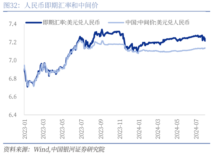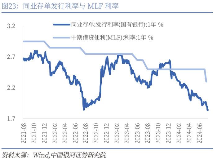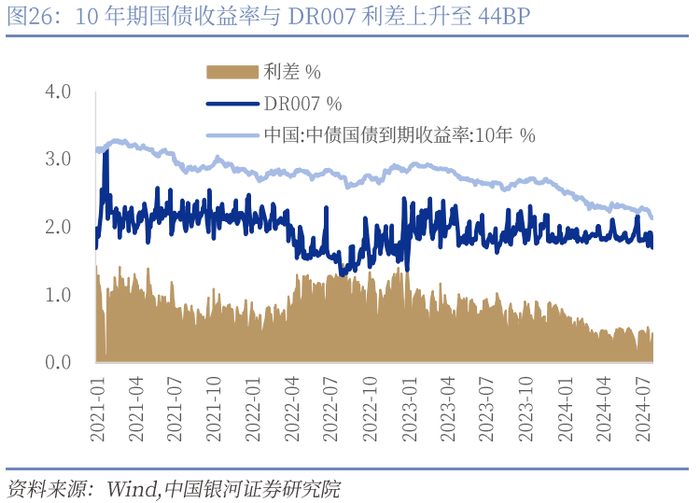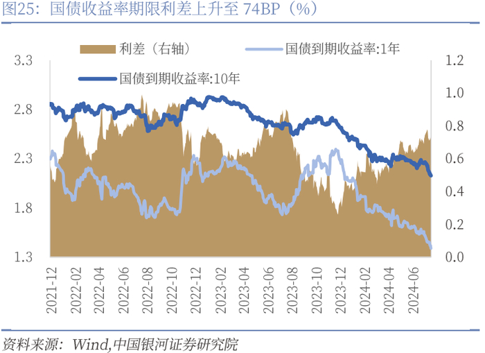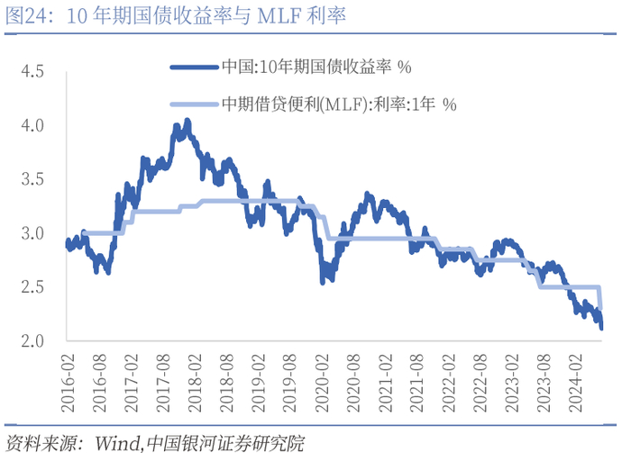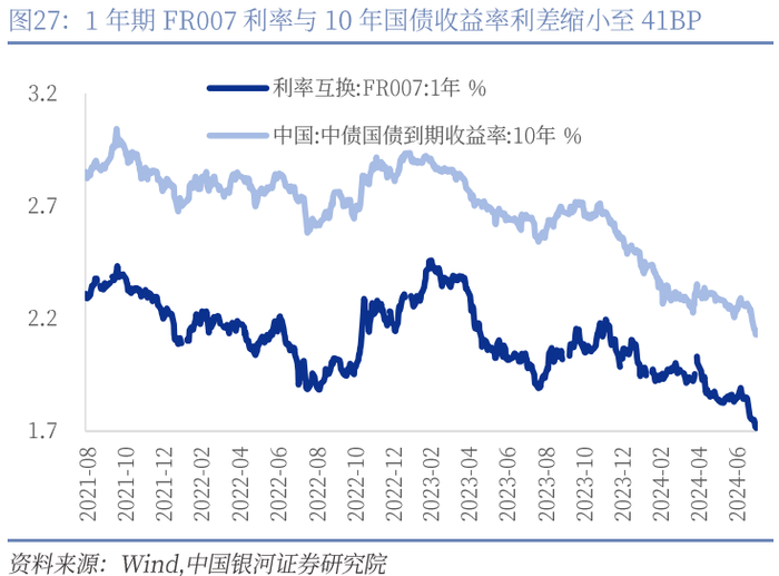 三季度有希望继续降准、降息,全年仍有25-50BP的降准空间和10-30BP的降息空间。美国7月失业率意外上升至4.3%,触发Sahm法则衰退预警。虽然我们认为美国经济年内达成软著陆仍有重要支撑,但并不阻碍市场进行衰退交易,美国十年期国债收益率快速回落至3.8%,中美利差快速收窄。在此背景下,人民币汇率压力阶段性解除。货币政策目标的重心将由国际收支平衡切换至促进经济增长,汇率对降息的制约暂时消退。同时,“积极支持收购存量商品房”方面,央行今年推出的3000亿元工具使用进度依然较慢,未来有可能进一步加码。另外,PSL也有一定概率调降利率并重启,PSL的利率可能会下调30BP或以上。