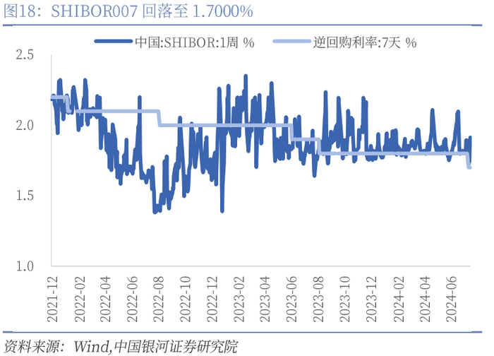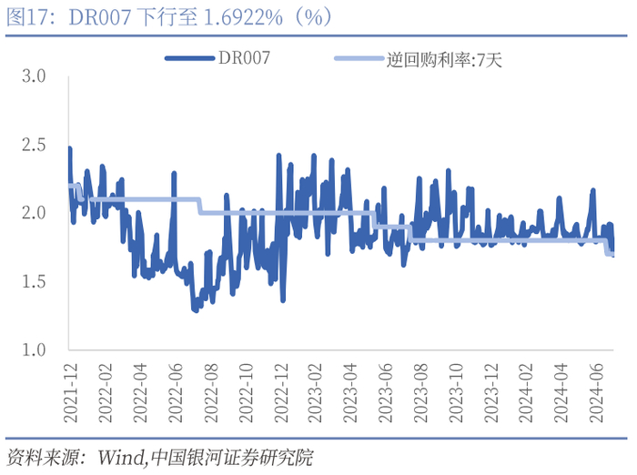 货币市场利率跨月后回落:SHIBOR007和DR007分别收于1.7000%(-21BP)、1.6922%(-23BP)。GC007收于1.8250%(-15BP)。R007收于1.8044%,与DR007利差11BP。
