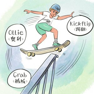 4.滑板是一项极具街头特色的项目,在这项运动中,滑手们脚踩滑板,各显神通。滑板动作包括:奥利(Ollie)、踢翻(Kickflip)、抓板(Grab)等。