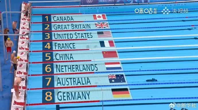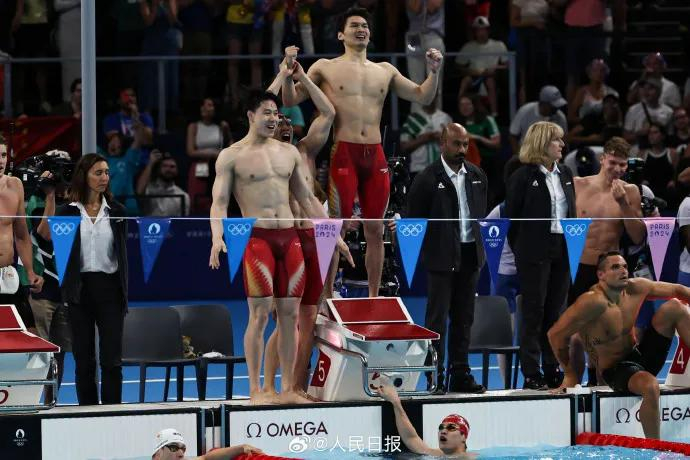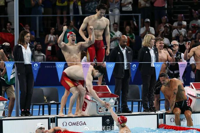 巴黎奥运会游泳赛场最后一个比赛日,由徐嘉余、覃海洋、孙佳俊、潘展乐组成的中国队取得历史性突破,首次夺得男子4×100米混合泳接力奥运金牌!