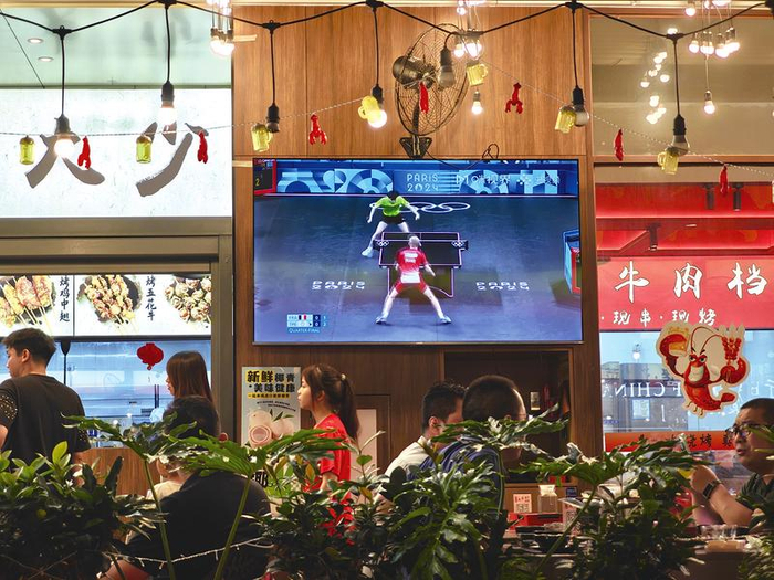8月1日晚,东盟商务区一酒馆内,大屏电视正播放奥运会乒乓球男单比赛,几名食客看到选手打出精彩好球后连连碰杯,气氛十分热烈。市民吴先生说:“一个人在家里看比赛太无聊了,约上朋友边吃边看肯定热闹一些。”