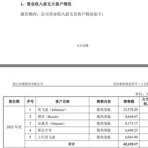 说明书显示,黄山谷捷是全球功率半导体龙头企业英飞凌新能源汽车电机控制器用功率半导体模块散热基板的最大供应商,同时与国内外知名的功率半导体厂商博世、安森美、日立、意法半导体、中车时代、斯达半导、士兰微、芯联集成等建立了长期稳定的合作关系。
