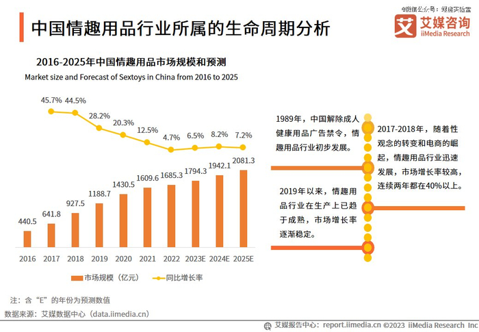 据iiMedia Research(艾媒咨询)的数据显示,2016年以来,中国情趣用品的市场规模一直保持稳定上升的态势,2022年市场规模已达1685.3亿元。情趣用品行业在生产环节已日趋成熟,市场增长率逐渐趋于稳定。