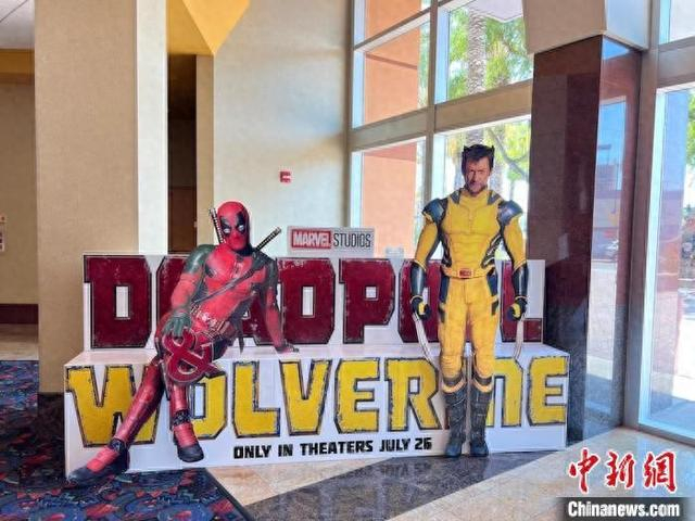 当地时间8月3日,美国洛杉矶一家电影院布置的漫威超级英雄电影《死侍与金刚狼》(Deadpool & Wolverine)立体海报。中新社记者 张朔 摄